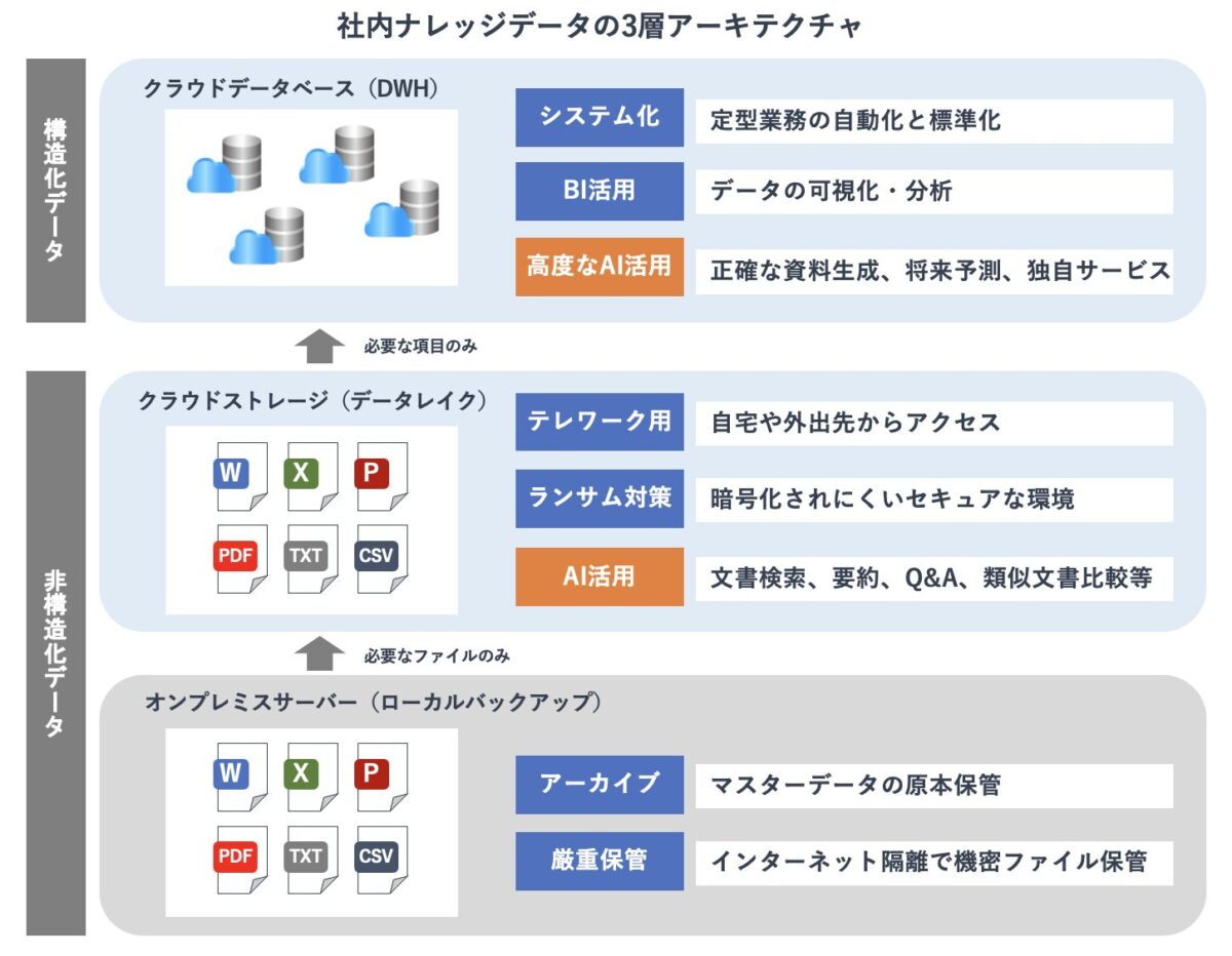 その後、この企業ではナレッジデータの蓄積方針を、大きく3つの層(アーキテクチャ)で整理しました。